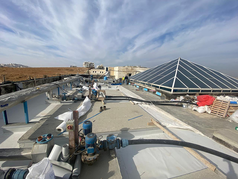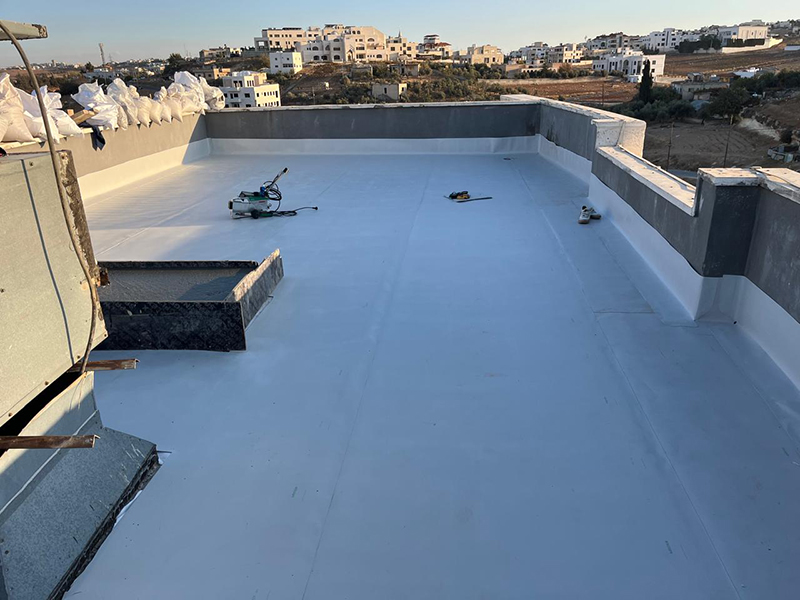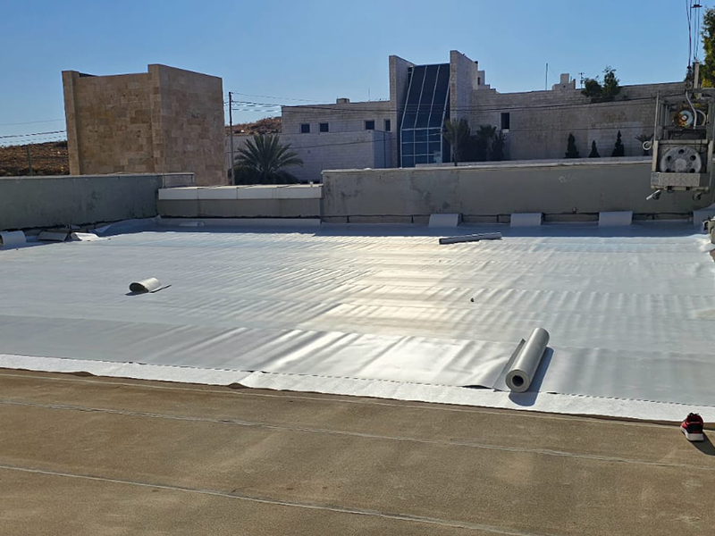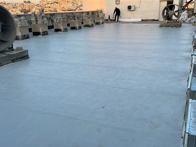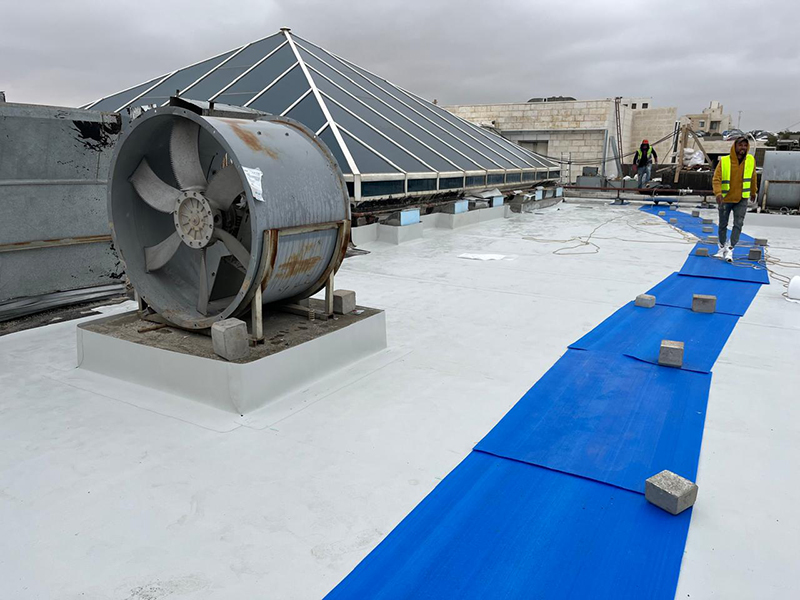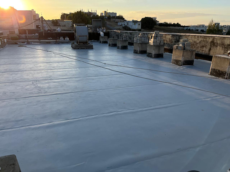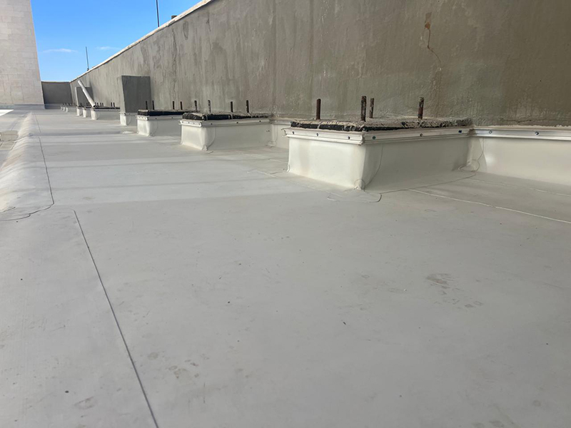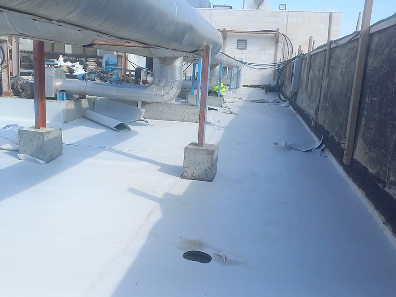 Leaks from ducts penetrations , doors sills and multiple locations of water penetration in the building roof. Benefits of koster system: no demolition or heavy preparations , just cleaning and geotextiles over the existing bitumen membrane and installing concrete up-stands around roof chillers and other machines,pipes and in front doors to achieve correct termination of the TPO.